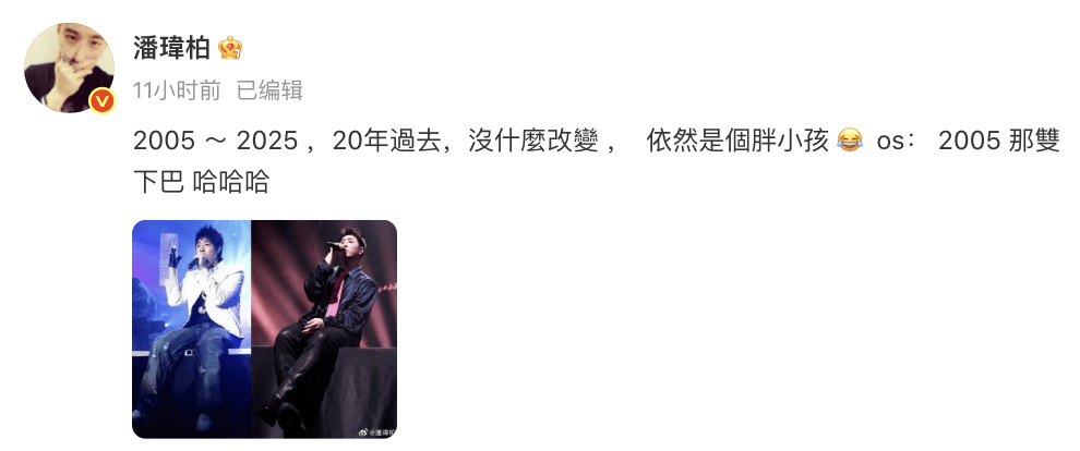 搜狐娱乐讯 4日,潘玮柏晒出自己20年前和现在的对比照,并发文调侃道:“2005~2025,20年过去,没什么改变,依旧是个胖小孩。os:2005那双下巴哈哈哈。”随后,潘玮柏又发文道:“好吧,上热搜了。。既然大家都看到我以前的体重,我只好努力回到以前的体重。毕竟。。 我也是要面子的。我宣布节目录完后正式退出美食界。美食的路上,再会了!”最近,潘玮柏参加了一档美食类节目备受关注,不少网友调侃他像“老鼠掉进米缸”。
