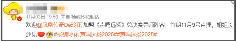 凤凰传奇受曾毅佩戴“不雅手表”事件影响,取消了后续一系列演唱会行程,玲花单人也未出席公开活动。时隔4个月,玲花终于传来新行程,有爆料称玲花将以导师的身份加盟《声鸣远扬》节目总决赛录制,引发热议。