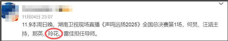 据广东卫视消息,《声鸣远扬》总决赛直播就是11月9日,与多位瓜主的爆料信息匹配。属性偏芒果的爆料号称当晚主持人是汪涵和何炅,导师有那英、雷佳、玲花,具有一定的可信度。