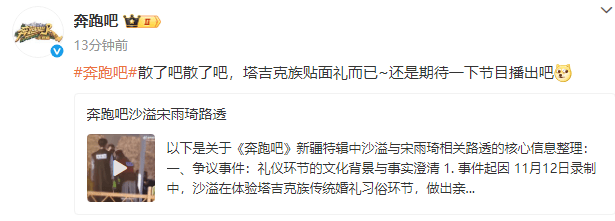 搜狐娱乐讯 12日,有网友晒出《奔跑吧》综艺路透,视频中的沙溢疑似亲吻了宋雨琦,引发热议。刚刚,《奔跑吧》节目组官方账号发文回应称:“散了吧散了吧,塔吉克族贴面礼而已~还是期待一下节目播出吧。”