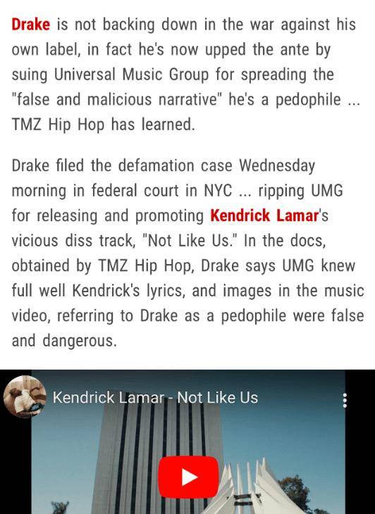 面对环球音乐的否认,Drake再次起诉环球音乐推广的《Not like us》等于散布谣言,因为这首歌是造谣说唱,造谣自己恋童。