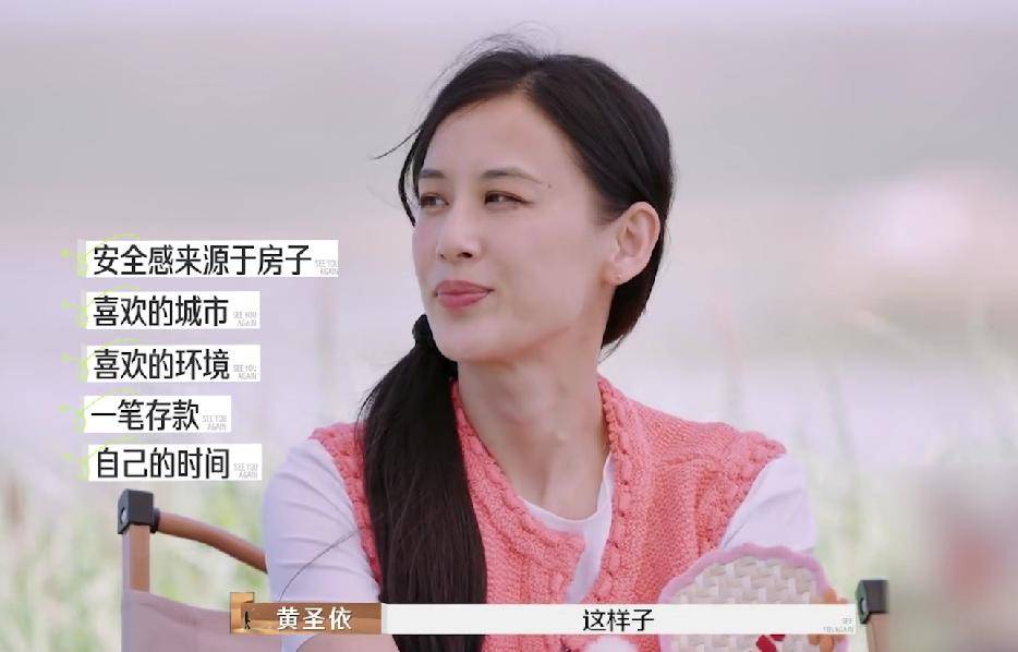 在《再见爱人》第四季中,黄圣依曾和张泉灵表示,她希望的安定生活是能在喜欢的城市拥有一处自己的房子、拥有一笔储蓄然后能拥有属于自己的时间,这能让她内心获得安全感。