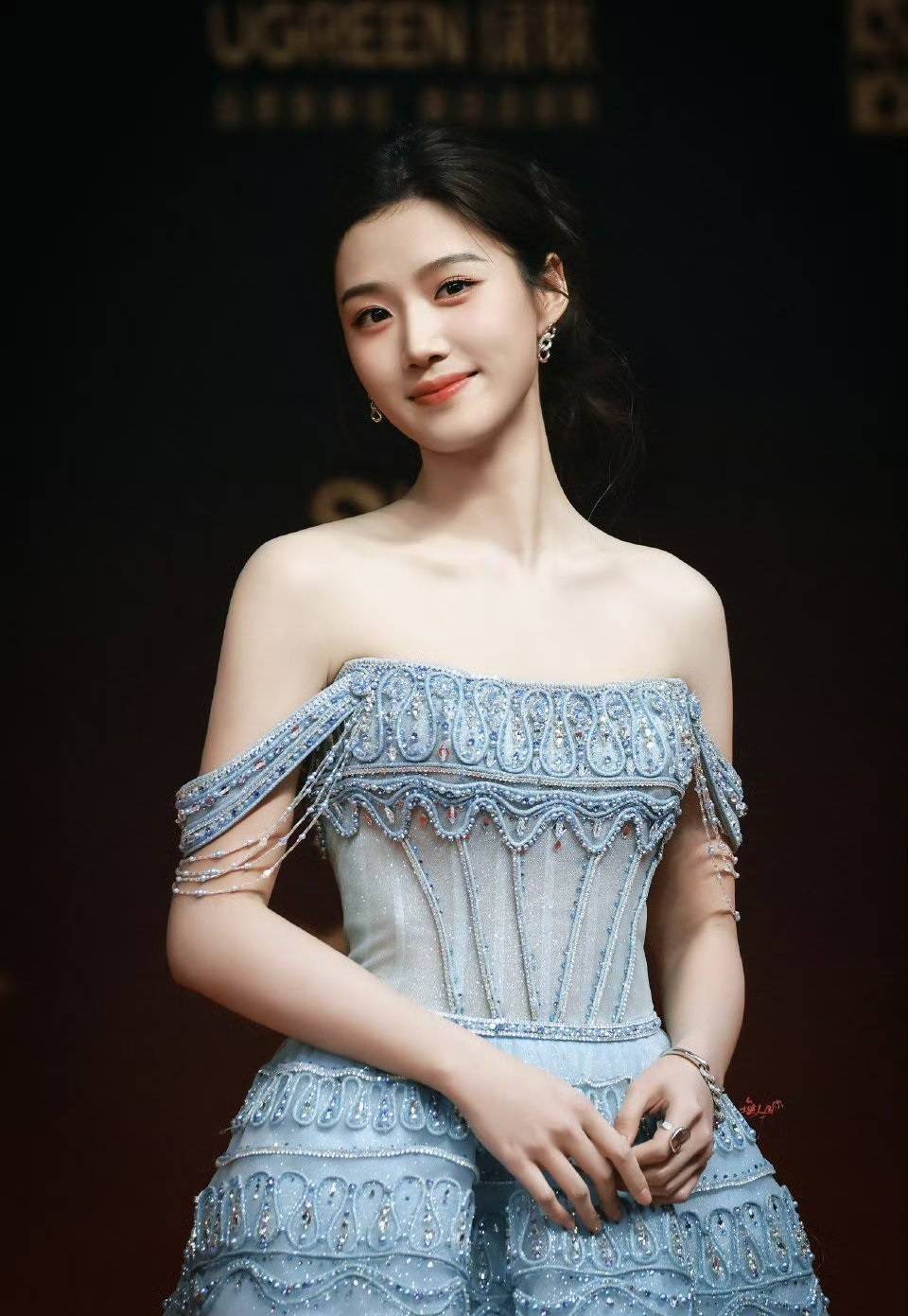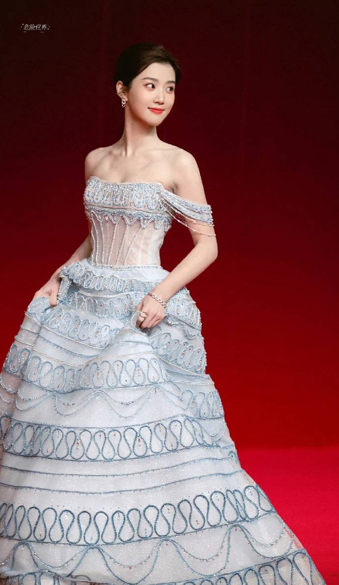 工作室发布的精修图中,卢昱晓身着浅蓝抹胸纱裙,披肩长发搭配宝蓝色珠宝,被赞"冰雪公主"。但红毯现场改为卢昱晓贴头皮盘发,未佩戴项链且耳饰突兀,视觉重心失衡暴露脸型缺陷,被批"浪费艺人肩颈优势"。