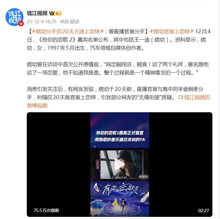 时间线拉紧看:2025年11月14日,痞幼在直播中正式宣布与交往9个月的高中同学男友“小袁”分手,强调两人已“退回朋友关系”。话音落下仅20天,12月4日,芒果TV《有你的恋歌2》官宣嘉宾名单,“王一迪”的名字赫然在列,节目给她的宣传定位直白又扎眼:“告别前任,重启心动”。