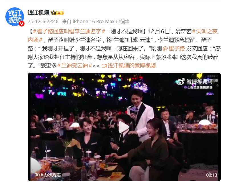 当翟子路在尖叫之夜主持台上脱口将“李兰迪”喊成“云迪”的瞬间,一场预料之中的尴尬却意外演变成了全网玩梗的欢乐盛宴。这场口误,连同当事人高情商的“现场直播”与“在线认领”,成功逆袭为内娱罕见的“失误变名场面”事件。