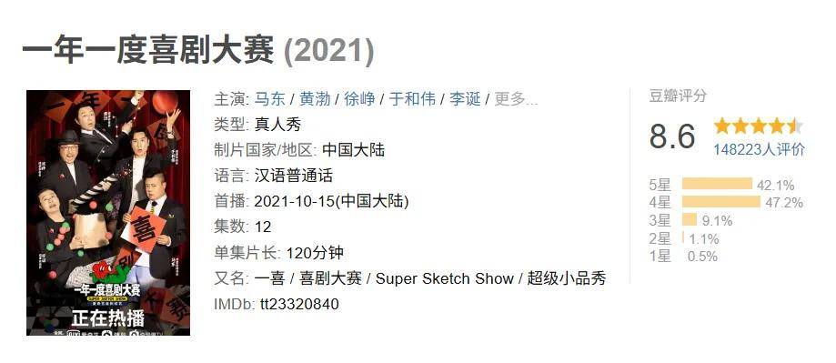 2021年《一年一度喜剧大赛》第一季上线时,在社交媒体上热度与口碑持续攀升,14.8万人给出的豆瓣8.6分足以证明其带给观众的欢乐。