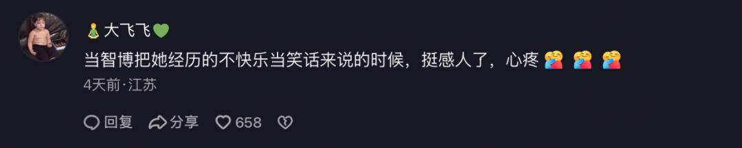 @累子 用「家像一把缠着头发的梳子」的比喻,将中国式家庭关系中甜蜜的负担与复杂的爱意具象化,引发评论区关于家庭关系的集体共鸣。在@智博 的表达里,总带着一股子东北人的直给。她在节目中把自己的脆弱摊开来讲,让无数人看到——坦诚脆弱,接纳自己才是真正的「漂亮」。