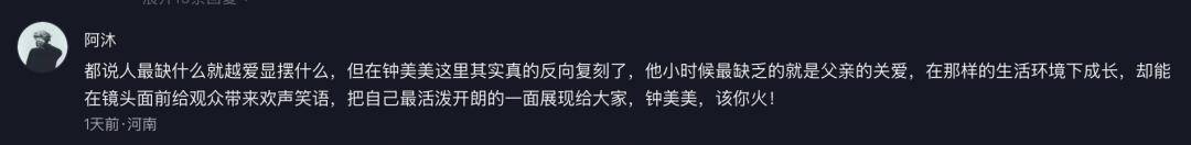 在更年轻的一批创作者身上,真实又呈现为另一种形态。比如 @钟美美,他不再只靠模仿取胜,而是把早熟的高光、家庭里的压迫感、以及成长中那些刺痛的细节摊开、掰碎来说。正如一条高赞评论所说:一个从小最缺父爱的人,却把最活泼、最明亮的一面留给了观众——这种勇气,让人看到一个年轻人如何在刺痛中长大,又如何依然选择把笑声交出去。