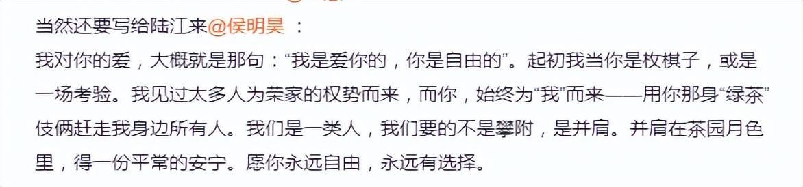 恋人陆江来(侯明昊饰)被她定义为“并肩而非攀附”,引用“我是爱你的,你是自由的”诠释平等爱情观,坦言最初视其为棋子,最终被其“始终为‘我’而来”的真诚打动。