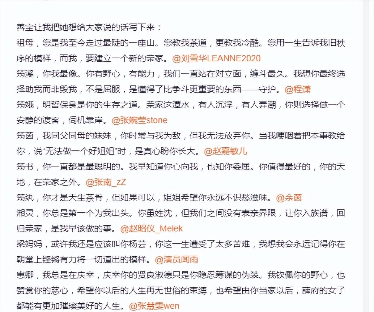 特别感谢编剧于正、导演张之微等主创,称剧组共同努力的日子是“心中最美好的回忆”,并以“茶之道,初尝或苦,回甘却久”呼应剧中茶文化传递的坚韧价值观。