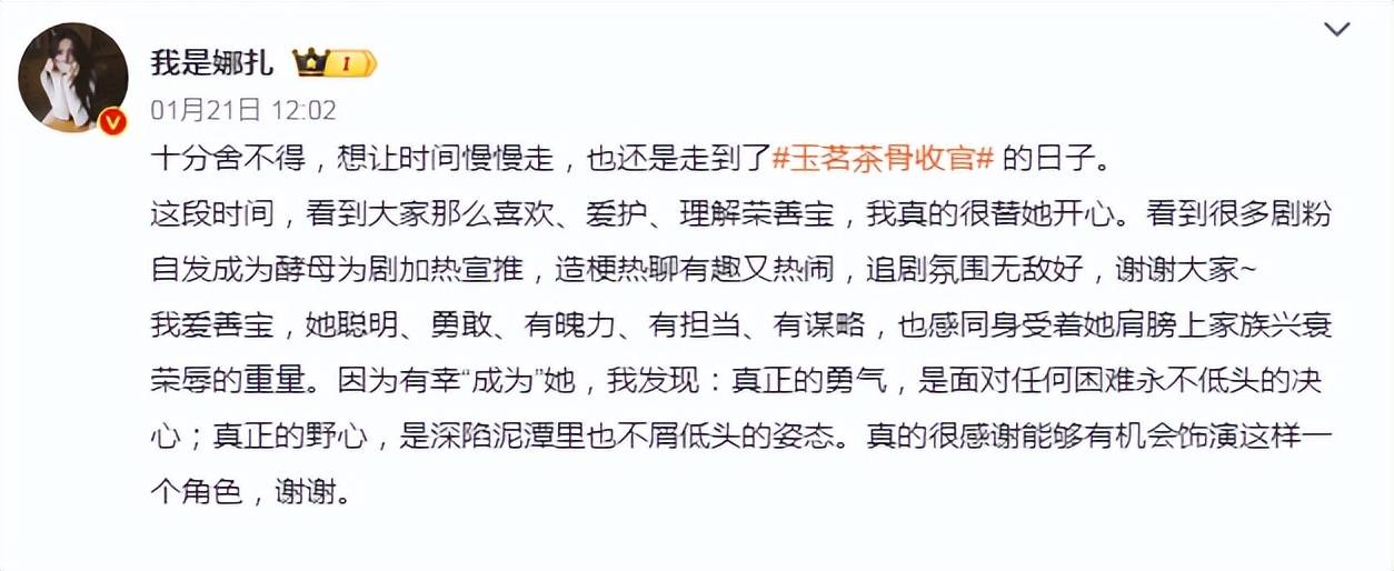 2026年1月21日,演员娜扎在《玉茗茶骨》收官日发布千字长文告别角色“荣善宝”,以角色口吻向剧中人物撰写专属寄语,引发观众对剧情内核与演员成长的深度共鸣。
